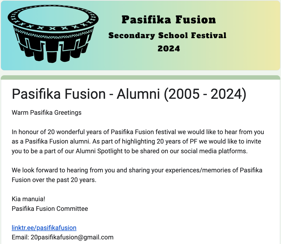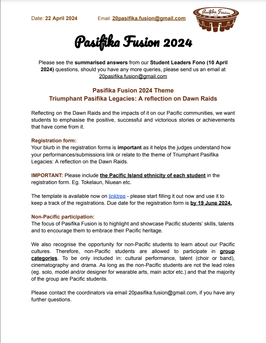 Contains all important information about Pasifika Fusion 2024, theme and question information, categories overview and contact information